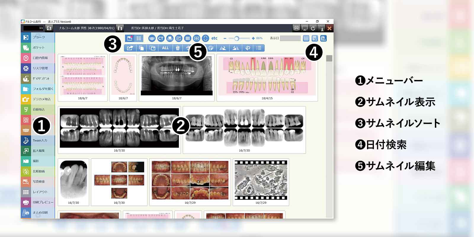 患者さんの情報を達人プラスで一元管理できます。撮影した画像の管理から編集、インフォームド・コンセントへの活用、診察した情報を入力し、口腔内状況を理解してもらうなど患者さんとのコミュニケーションをサポートします。
